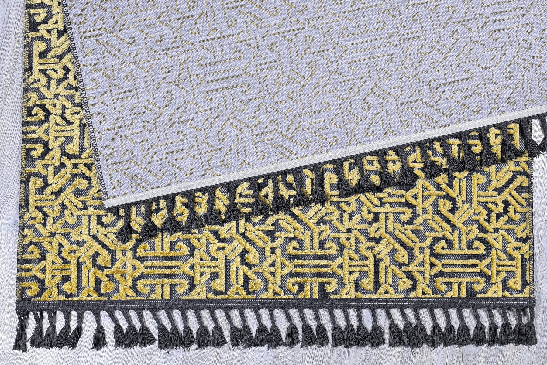 Pamuk ve Kadife tuşeli akrilik ipliklerden modern tezgahlarda üretilmiş ve el emeği özel saçaklarla süslenmiştir.
