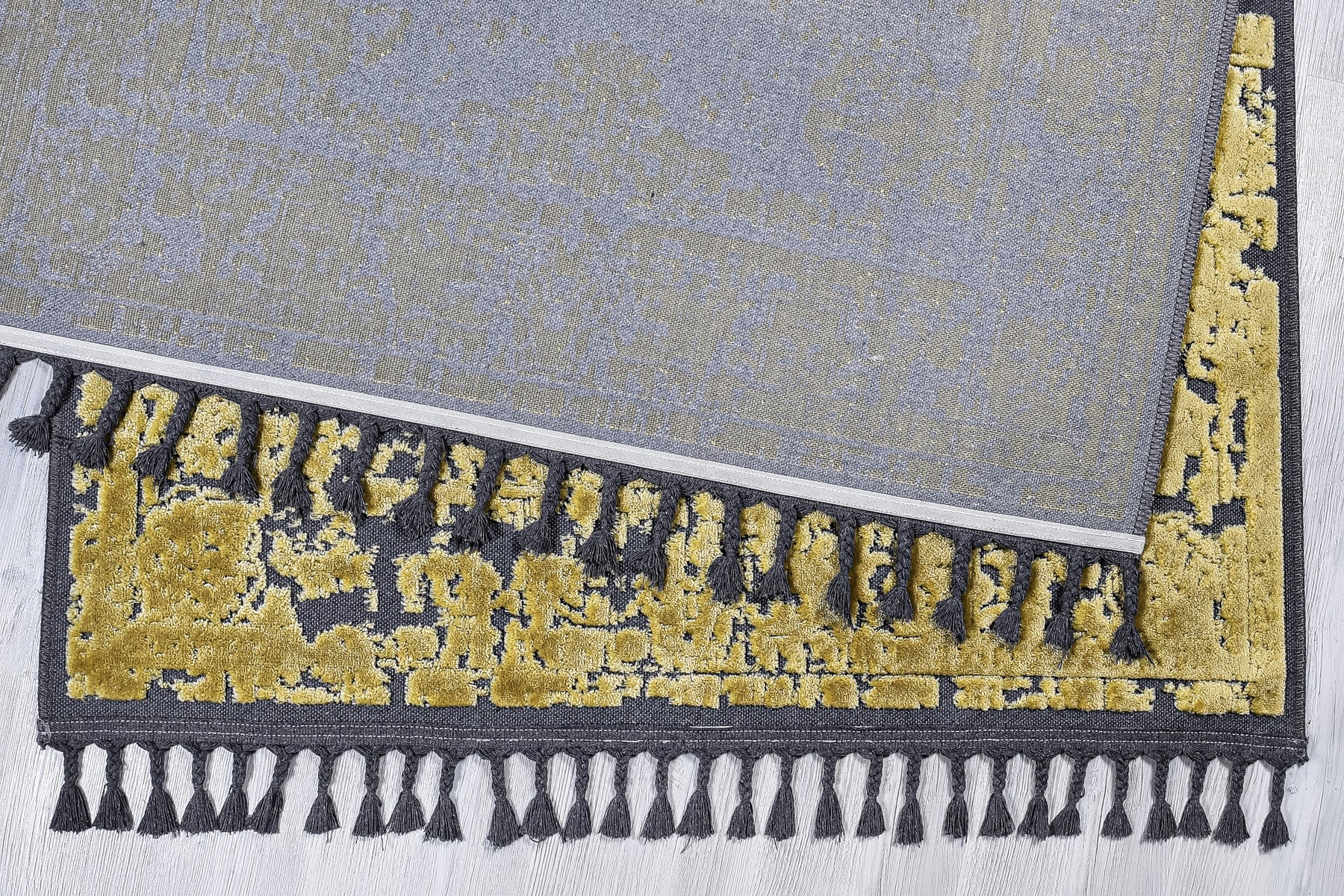 Pamuk ve Kadife tuşeli akrilik ipliklerden modern tezgahlarda üretilmiş ve el emeği özel saçaklarla süslenmiştir.